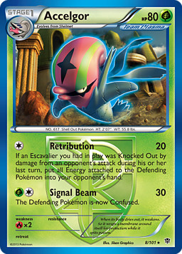 Si un Escavalier que tenías en juego quedó Fuera de Combate por el daño de un ataque de tu rival durante su último turno, pon todas las Energías unidas al Pokémon Defensor en la mano de tu rival.