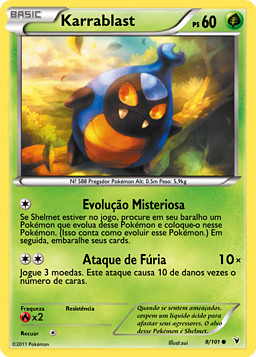 Si Shelmet está en juego, busca en tu baraja una carta que evolucione de este Pokémon y ponla sobre él. (Esto equivale a hacer evolucionar a este Pokémon.) Baraja las cartas de tu baraja después.