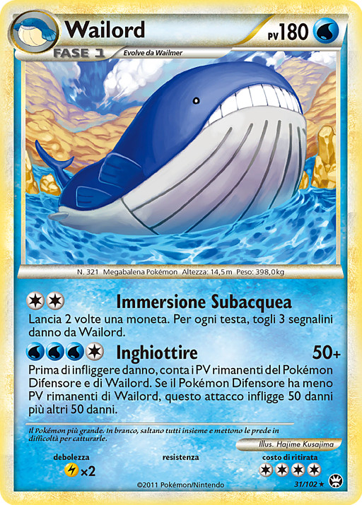Antes de causar daños, cuenta los PS restantes del Pokémon Defensor y de Wailord. Si al Pokémon Defensor le quedan menos PS que a Wailord, este ataque hace 50 puntos de daño más otros 50 puntos de daño adicionales.