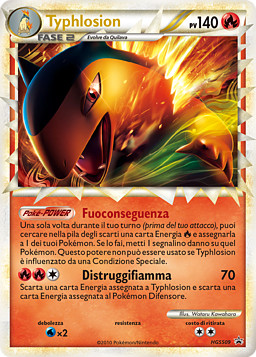 Una vez durante tu turno (antes de tu ataque), puedes buscar en tu pila de descartes una carta de Energía y unirla a 1 de tus Pokémon. Si lo haces, pones 1 contador de daño en ese Pokémon. Este poder no se puede usar si Typhlosion se ve afectado por u