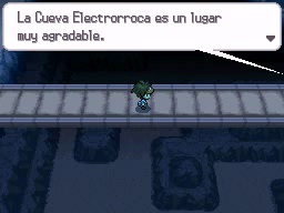 Al entrar en la Cueva Electrorroca verás a Bel, quien te hablará sobre la cueva. Para seguir por el camino, golpea desde la derecha el cristal de la imagen para que deje paso. Continúa ahora hacia arriba y golpea por la izquierda el cristal para poder avanzar. Continuando hacia la derecha te encontrarás con algunos entrenadores, tras lo cual tendrás que seguir hacia abajo.