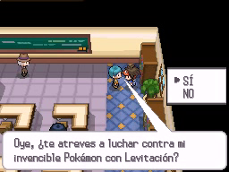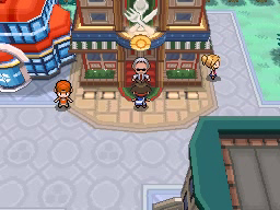 En uno de los edificios, al hablar con la chica de la primera imagen, conseguirás la Misión Festival "¡Piedra, papel o tijera!", mientras que en la escuela de entrenadores que hay arriba podrás conseguir unas Bayas Caquic. En esta última podrás también echar un combate contra el chico de la tercera imagen si respondes ¡Sí!, Gravedad y finalmente Rompemoldes. Ve tras eso al edificio que hay a la derecha del Centro Pokémon.