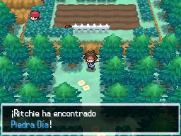 Si estás interesado por conseguir los objetos que aparecen en las siguientes imágenes, ve al final de la Ruta 14 y usa Cascada para, desde la zona de la primera imagen, pasar hacia la izquierda y entrar en el Santuario Abundancia, dedicado a Landorus. Ve hacia arriba para encontrar una Piedra Día y, tras eso, continúa por la izquierda para encontrar un Máx. Revivir, la MT92 Espacio Raro y un Carameloraro.