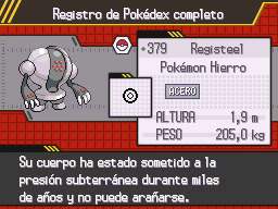 Tras haberte capturado a Regirock, y obtenido la Llave Hierro si estás en Pokémon Blanco 2, ve a Nexo Teselia en el menú principal y selecciona Sala Hierro en Sistema Clave->Puerta Secreta. Tras eso, ve al norte de Ciudad Fayenza con un Pokémon que conozca Surf y atraviesa el Túnel Yakón hasta el final, en donde te encontrarás la vagoneta de la primera imagen, la cual te llevará a varias vagonetas más y a una zona en la que tendrás que usar Surf. Cuando llegues a una sala enorme, ve hacia arriba y llegarás hasta Registeel.
