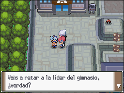 Delante del gimnasio, te encontrarás con Maya, y luego te aparecerá Manati. Se marcharán los dos, así que entra en el gimnasio. En este gimnasio los entrenadores usan Pokémon de tipo Lucha, así que los tipos Volador y Psíquico te lo pondrán fácil. Para avanzar por el gimnasio, debes ir golpeando esos sacos rojos que hay colgando, para abrirte paso.