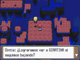 Cuando le hayas vencido, Cynthia curará a tus Pokémon. Guarda el juego, porque tendrás que enfrentarte a Giratina, así que mejor captúralo. Sigue el camino recto al norte, y te encontrarás con éste Pokémon, en el nivel 47 y en su forma original: