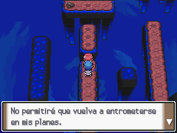 Cuando llegues al mundo inverso, notarás un completo silencio. En este mundo no hay ningún Pokémon ni ningún entrenador, pero no te resultará tan fácil, pues aquí tendrás que pasar por los muros, atravesando objetos o saltando entre baldozas ocultas. Primero, dirígete hacia Cynthia y síguela. Ahora, aparecerá Mesprit, que te dirá que tienes que ir por la pared. Ahora, dirígete hacia Cynthia y habla con ella.
