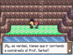 Ahora aparecerás en la entrada de la Cueva Retorno. Cynthia te dará las gracias, y te dirá que será mejor que vayas a ver al Profesor Serbal. Vuela a Pueblo Arena, y dirígete al laboratorio del profesor, donde estará esperándote.
