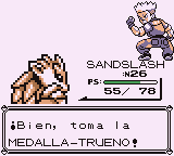 Lt. Surge es el Líder del Gimnasio Carmín. Sus tres Pokémon se encuentran entre los niveles 21 y 24. Cuando lo derrotes, te entregará la Medalla Trueno y la MT24 Rayo. Ahora, sal del gimnasio y dirígete a Ciudad Celeste.