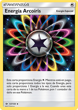 Une Energía Arcoíris a 1 de tus Pokémon. Durante el juego, la Energía Arcoíris proporciona todo tipo de Energía, pero solo ofrece 1 Energía cada vez. (No tiene ningún efecto aparte de proporcionar Energía.) Cuando unas esta carta de tu mano a 1 de tus Pokémon, pon 1 contador de daño en ese Pokémon. (Mientras no juegas, la Energía Arcoíris cuenta como Energía .)