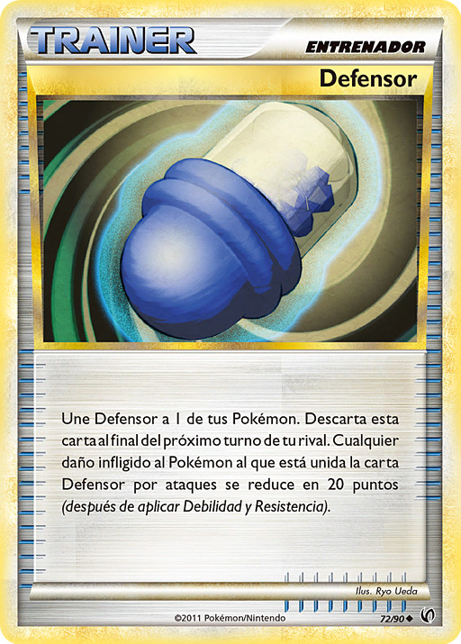 Une Defensor a 1 de tus Pokémon. Descarta esta carta al final del próximo turno de tu rival. Cualquier daño infligido al Pokémon al que está unida la carta Defensor por el ataque de un rival se reduce en 20 puntos (después de aplicar Debilidad y Resistencia).