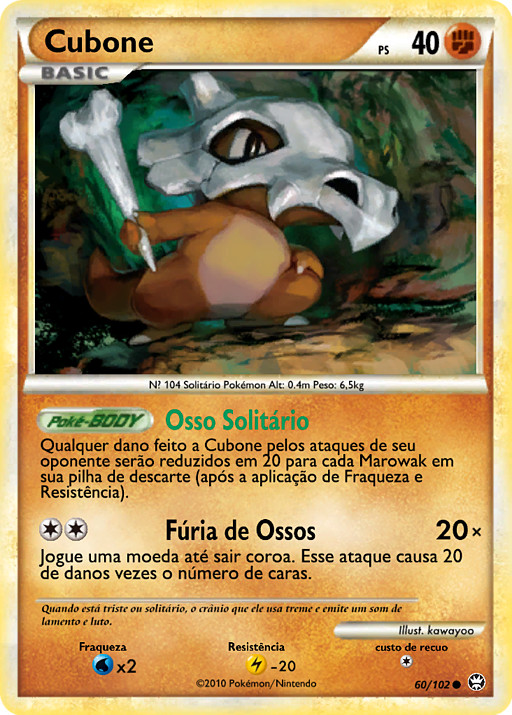 Los daños causados a Cubone por los ataques de tu rival se reducirán en 20 por cada Marowak que tengas en tu pila de descarte (después de aplicar Debilidad y Resistencia).