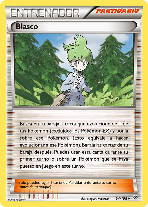 Busca en tu baraja 1 carta que evolucione de 1 de tus Pokémon (excluidos los Pokémon-EX) y ponla sobre ese Pokémon. (Esto equivale a hacer evolucionar a ese Pokémon). Baraja las cartas de tu baraja después. Puedes usar esta carta durante tu primer turno o sobre un Pokémon que se haya puesto en juego en este turno.