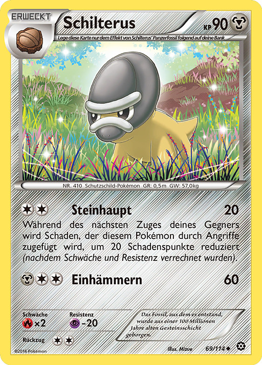 Mira las 7 últimas cartas de tu baraja. Puedes enseñar 1 Shieldon que encuentres entre ellas y ponerlo en tu Banca. Pon el resto de cartas de nuevo en tu baraja y barájalas todas.
