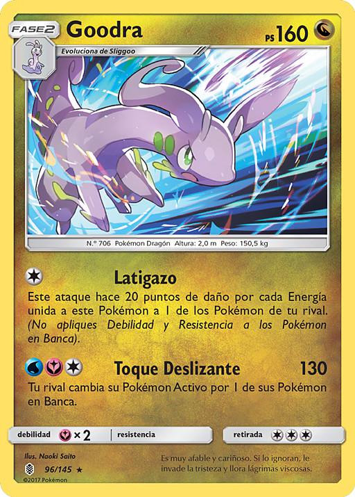 Cada vez que unas 1 carta de Energía de tu mano a este Pokémon, puedes buscar en tu baraja a Goomy y ponerlo en tu Banca. Baraja las cartas de tu baraja después.